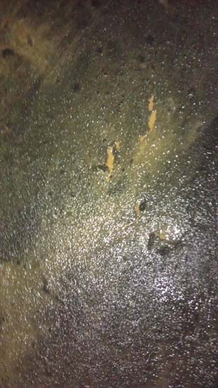 4. Вода со стены стекает на пол, попадая под резину, нанесенную на горизонталь. Видно, что стена даже не то, что явно сырая, можно сказать, — мокрая, т.к. вода стекает сверху вниз.